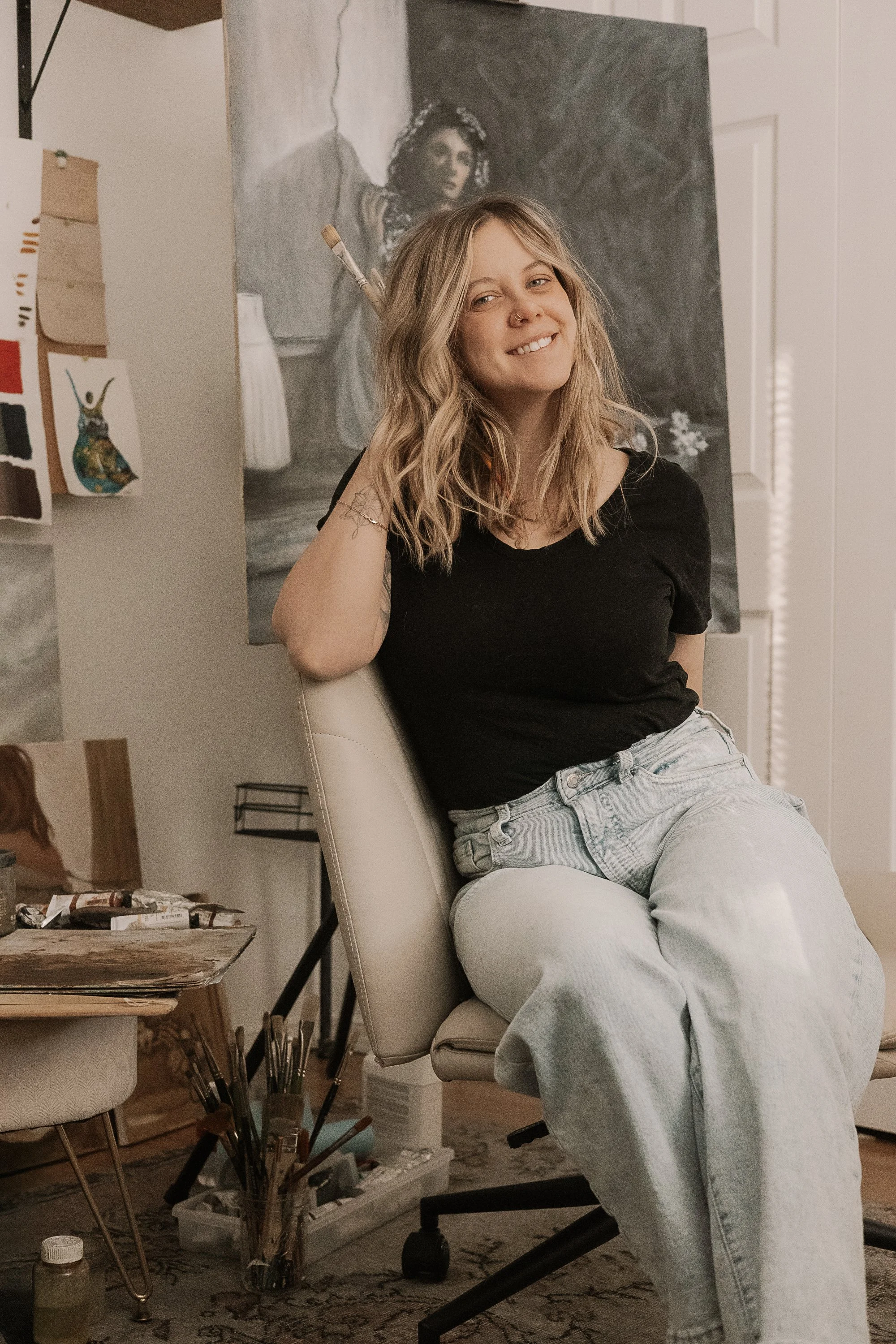 I began teaching myself the basics of painting in watercolors and acrylics, however it wasn’t until years later that I started taking formal art classes (both private lessons and university lessons where I could find them). I still work full-time in the mental health field (and have completed a Master’s degree and obtained independent licensure in my field of practice) and when I’m not working or painting, my favorite way to spend time is mountain hiking with my husband and our pup, Ryker. Painting has become such a core part of my own mental health journey and has healed so much for me, and I hope that my paintings can serve a similar purpose for others! While I do enjoy painting Alaskan landscapes en plein air (or on-location painting- the beauty of this land is truly unmatched), my real passion lies in figurative and floral paintings and capturing raw emotions and the delicate beauty of the relationship between humanity and nature- how we bloom, fade, evolve, and root ourselves in experience, creating visual poetry about existence.